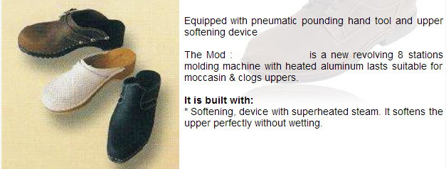 Revolving 8 stations moulding machine with heated aluminium lasts suitable for mocassin & clogs uppers